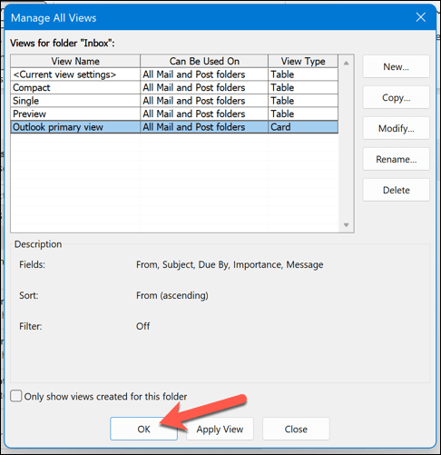 - Press OK in the Manage All Views box to save your settings.