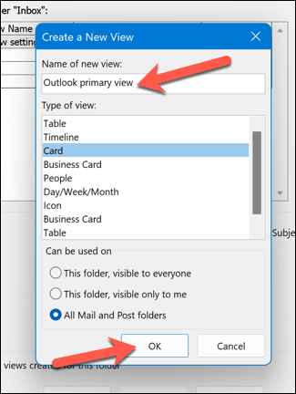 - Enter a name for your new view and choose the type of view you want to create. You can also specify which folders you want to apply your view to. * Click OK to open the Advanced View Settings dialog box for your new view.