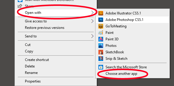 - **Right-click **the file and select **Open with**. (Note: If you don’t see **Open with**, hold down the **Shift **key and then right-click the file.) * Even if you see the program you want to associate with that file type in the list, select **Choose another app**. (If you just select the program from the list displayed, the file will open in that app this time, but the default file association will remain unchanged.