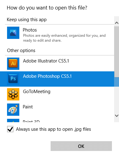 Imagine, for example, you just installed Adobe Photoshop on your PC. From now on, you want Windows to use Photoshop to open .jpg files, but currently Windows always opens .jpg files with the default Photos app included in Windows 10.
