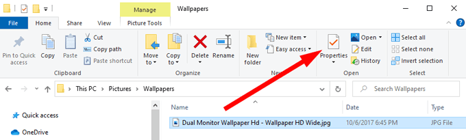 - Select the file and make sure the Home menu tab is active. On the toolbar ribbon, select Properties. (Alternatively, right-click on the file and select Properties.)