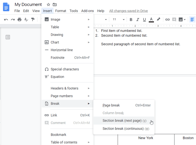 The “next page” option will push the text below your cursor down to the next page. The “continuous” option keeps all text in the same place, but inserts the formatting break where your cursor is located.