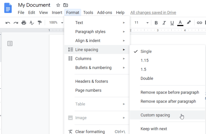 This opens a new Custom spacing window where you can set the specific spacing between either individual lines or paragraphs in your document.