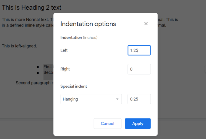 In the Indentation options pop-up window, use the Left or Right fields (displayed in inches) to set the distance from the margin you’d like bullet lists to go.