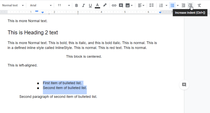 You can get around this by modifying the indentation formatting for all bullet lists in your document. To do this, select Format from the menu. Then select Align & indent, and select Indentation options.
