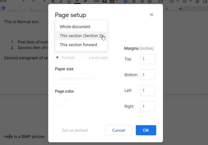 When you get to the Page setup window, you’ll see that it now displays a dropdown where you can select the section of the document that you want to format.