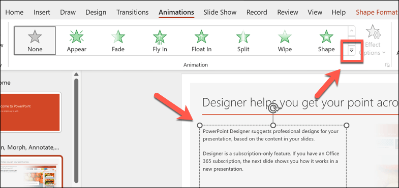 If you want to change the type of animation effect applied to an object on your slide, such as text, images, or shapes, you can do so by following these steps.