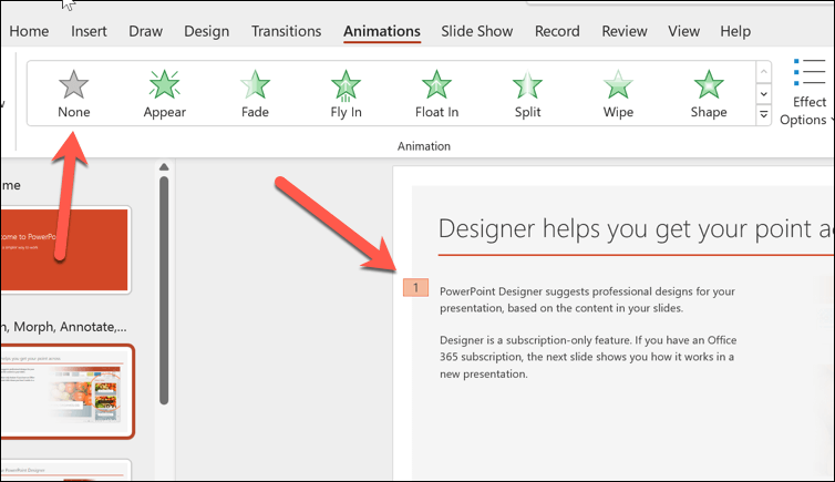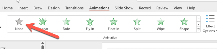 - Select the Animations tab on the ribbon bar. In the Animation group, click the None option in the Animation gallery. This will remove any animation effect from the selected object.
