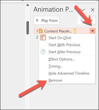 - Next, click the object that has the animation effect that you want to remove. * In the Animation Pane, select the animation effect that you want to remove. A small number will appear next to it, indicating its order in the sequence of animations. * Click the down arrow next to the animation effect and select Remove from the menu to remove it.
