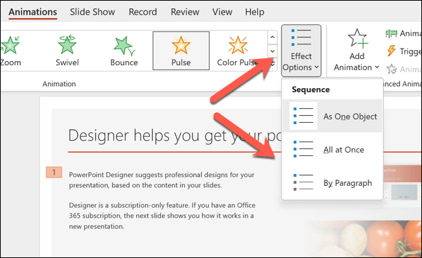 - You can also change the settings for an animation effect, such as the duration, delay, or direction by clicking the Effect Options button in the Animation group. A drop-down menu will appear with different options to choose from, depending on the type of animation you’ve enabled.