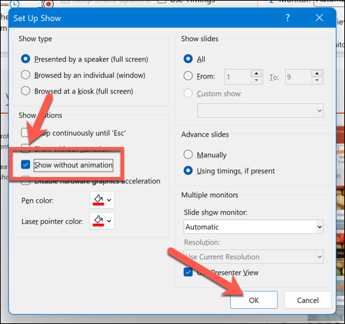 With this option enabled, animations won’t appear while you’re actively presenting your presentation. You’ll need to repeat these steps and remove the checkbox next to Show without animation to restore them afterward.