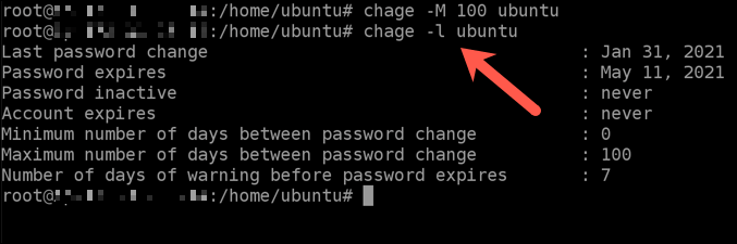 - With the details set, you can check the expiration date by typing **chage -l user **and selecting **Enter**, replacing **user **with the username you wish to check.