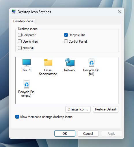 To do so, right-click the Recycle Bin icon on your desktop and choose Properties. If you don’t have the icon on your desktop, open the Start menu, search Windows for desktop icons, and select the Themes and related settings option. On this window, scroll down to Desktop icon settings.