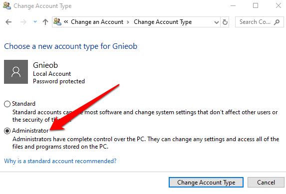- Click on the user account and select **Change account type**.
