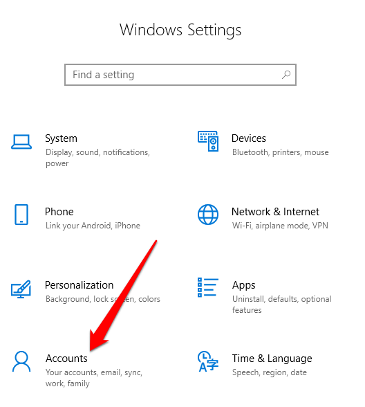 - Click Start > Settings and select Accounts.