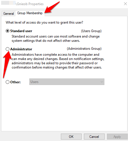 - Next, click the **Group Membership** tab. Select the **Standard user** or **Administrator** account you’d like to change. You can also choose different user groups under the **Other** membership option. Here, you can select **Remote Desktop users, Guests, Power Users, Cryptographic operators**, and **backup operators** among others.
