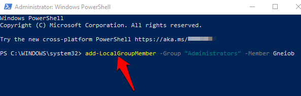 - Type this command to change the account to administrator: **add-LocalGroupMember -Group “Administrators” -Member “ACCOUNT-NAME”**
