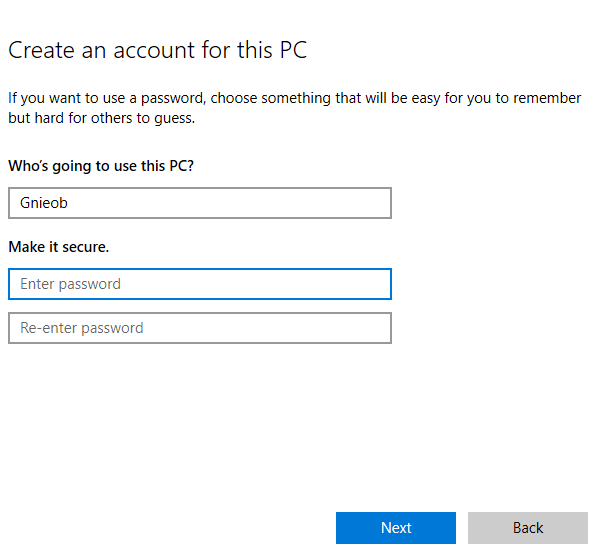Enter a username and password, and type a password hint or select security questions. Click Next once you’re done, and then use any of the methods above to change the user account to an administrator.