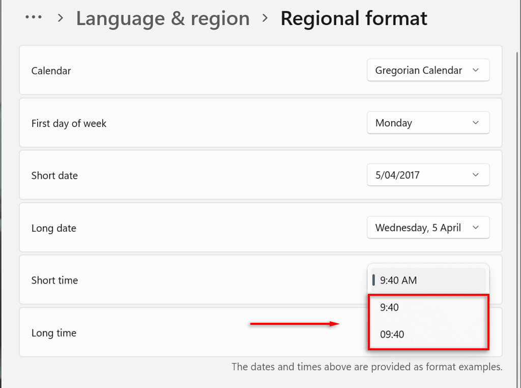 - First day of week: Set any day of the week to be the first day in your calendar. Typically, people prefer either Monday or Sunday. * Short date: The short date format refers to the all-numerical dd/mm/yy version of the date (for example, 06/18/2022). The short date setting offers several number formats depending on whether you prefer the day, month, or year to appear first. You can also change whether you want to display the date with slashes or dashes. * Long date: This refers to the written version of the date. This setting allows you to choose whether to display the day (for example, Wednesday) as well. * Short time: This setting displays the time as a short series of numbers representing hours and minutes (for example, 11:24 AM). There are three variations for the short time format. To change to a 24-hour format, select Short time and select the number without AM or PM displayed.