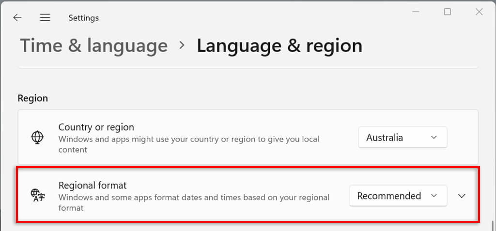 - Select Regional format under the Region sub-header.