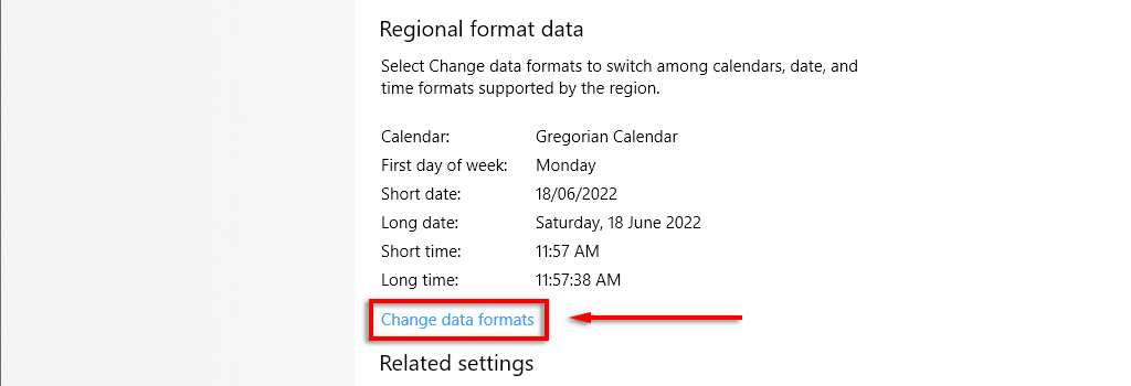 - At the bottom of the region settings, select Change data formats.