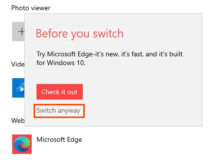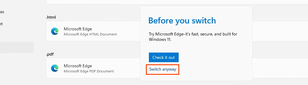 - The **Before you switch **pop-up will open. This is Microsoft providing a last-moment opportunity to stay with Edge. Select **Switch anyway **to continue changing the default browser.