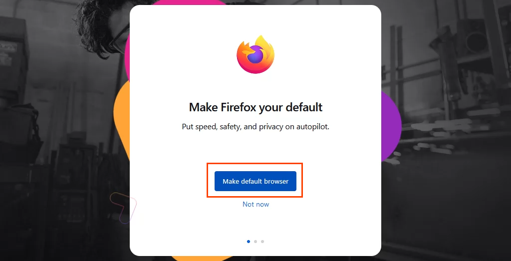 - When Firefox opens after installation, it will go through a setup wizard. The second choice in the setup process is to **Make Firefox your default**. Select the **Make Default Browser** button.
