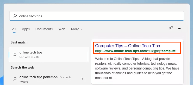 - Test to make sure it worked by opening the Start menu and searching for something like *online tech tips*. Select a web result, and it will open in Chrome or whatever you have set as the current default browser.