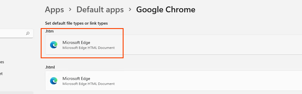 - In the new window, the top choice is the **.htm **file type. Select the bar style button underneath to change the default browser for that file type.