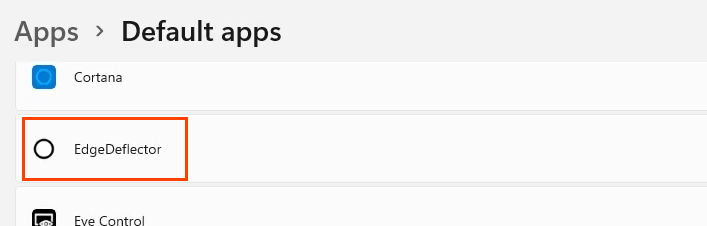 - Open **Default Apps **in Windows Settings and scroll to **EdgeDeflector**. Select it.