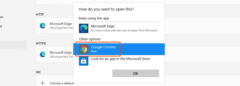 - In the next pop-up, select the desired browser and then select **OK **to set it as the default for the file type. Continue this process for all the desired file types and link types to open with the new default browser.
