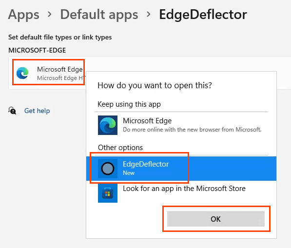 - Select the **Microsoft Edge **option, then in the **How do you want to open this?** Window, select **EdgeDeflector**, then select **OK**.