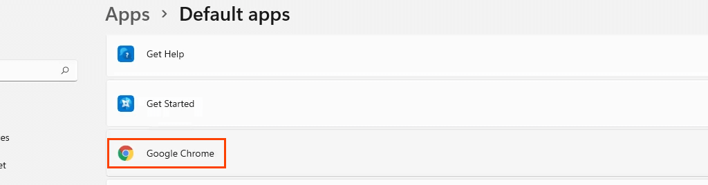 - In **Default **apps, scroll down to Chrome, or the browser’s name just installed, and select it.
