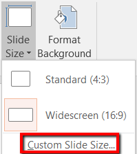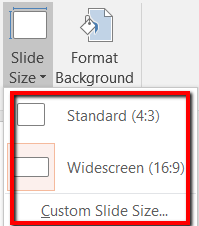 Clicking on this option will reveal a menu. It lets you pick the size of the slide that you want. Your choices are *Standard, Widescreen, *and Custom Slide Size.