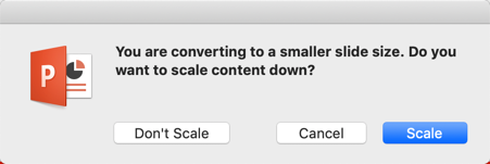 If you choose to scale it down, PowerPoint will try to fit everything as best it can into the smaller slide. If you choose Don’t Scale, the items that are outside the standard size will simply be out of the window. You’ll then have to decide whether to delete those items or move them back into the slide.
