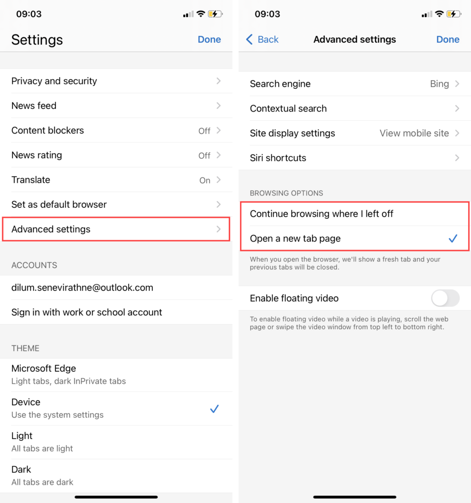 If you use Microsoft Edge on your Android or iOS device, you can configure Microsoft Edge to continue with your previous page or just a new page whenever you reopen the browser after exiting to the device’s Home screen.