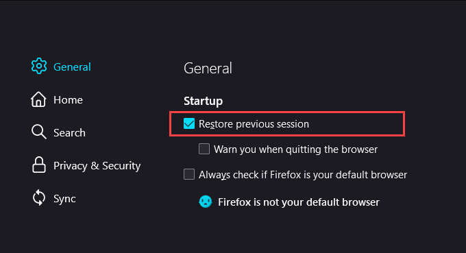 To access this option, you must switch to the **General **tab on the sidebar. Then, check the box next to **Restore previous session **if you want Firefox to load your last browsing session whenever you relaunch the browser.
