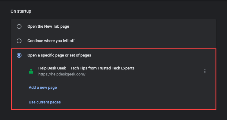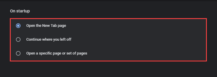 - Under the On startup section, you should find the following options: * Open the New Tab page