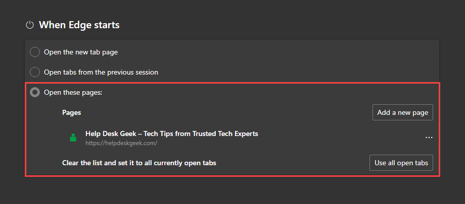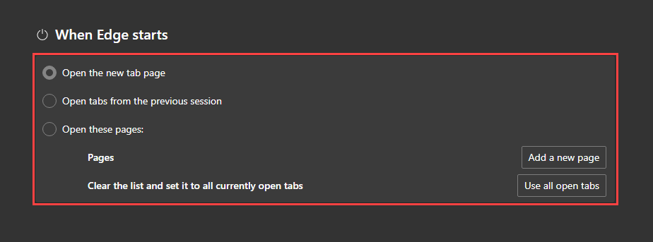 Being a Chromium-based browser, Microsoft Edge features a set of startup options similar to Google Chrome. You can pick between the default new tab page, open tabs from the previous session, or multiple custom pages.