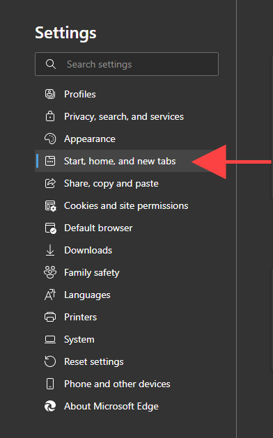 - Select Start, home, and new tabs on the Settings sidebar.