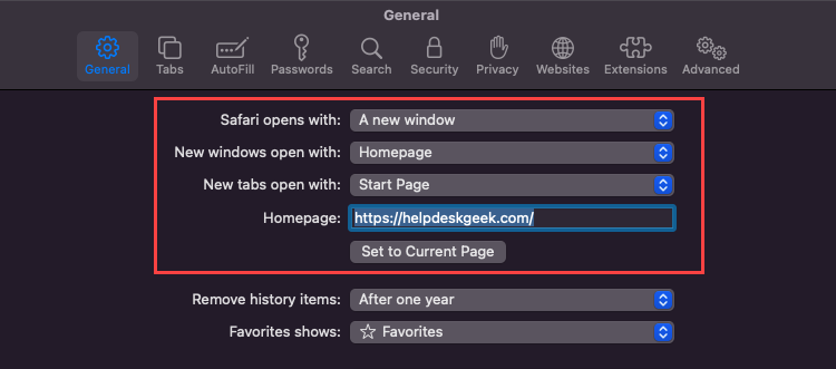 - Under the **General **tab, use the pull-down menus next to Safari opens with and New windows open with options to modify the start page: