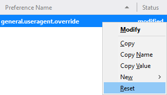 - Once you’ve input a user-agent string, hit Enter, and that’s it. This setting will remain persistent each time you restart your browser. If you’d ever like to reset this setting to its default value, just right-click on the preference name and select Reset.