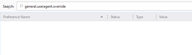 - Next, in the Search field at the top of this screen, type in general.useragent.override. You’ll likely be met with a blank screen. If your search finds a preference though, skip further down this page to where we’re modifying the value of it.