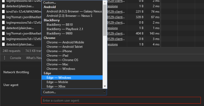 - While the preset list isn’t very extensive, clicking on Other… will give you the option to enter your own custom user-agent string.