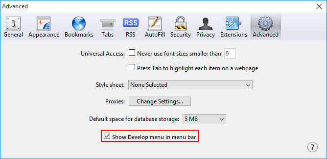 - On the window that pops up, click on the Advanced tab and then tick the checkbox of the bottommost option, Show Develop menu in menu bar.