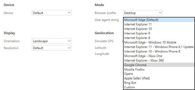 Edge’s emulation options are quite robust, allowing you to change your device, display orientation/resolution, geolocation, and user-agent string.