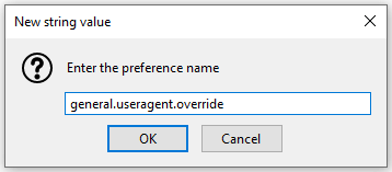 - If the preference isn’t there, right-click on a blank area of the page, hover New, and select the String option. Here, enter the same string that we searched for: general.useragent.override.