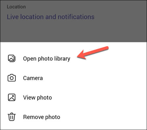 - From the bottom menu, select Open photo library to choose a new photo, or select Camera to take a new picture using your smartphone’s camera.