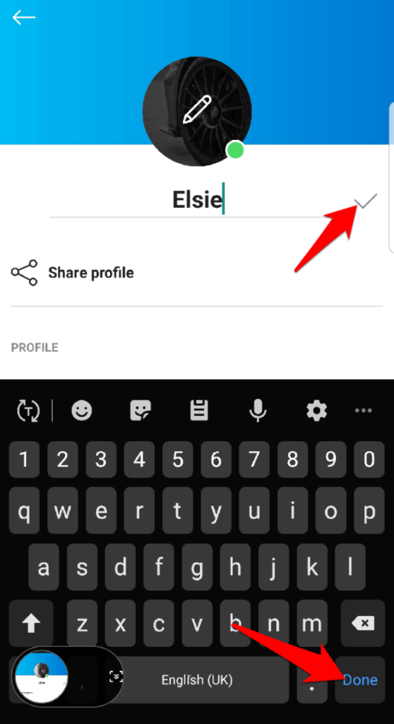 - Tap **Done **on your smartphone’s keyboard or tap the check mark at the right side of your display name to save the changes.