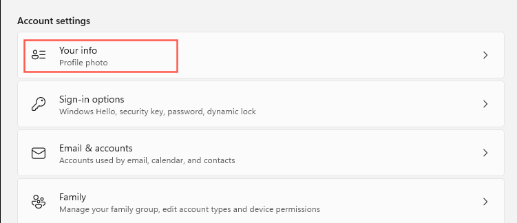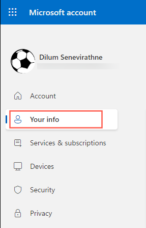 - A browser window should automatically launch and load the Microsoft account portal online—sign in using your username and password if prompted and select **Your info**.